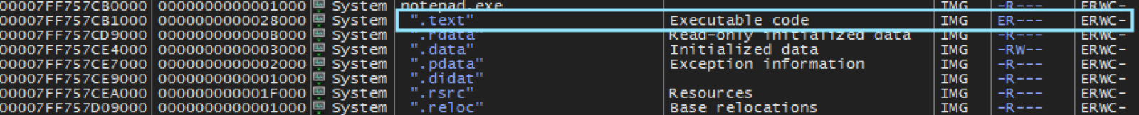 If we take a notepad.exe process as an example, we can see that the different sections of the executable have their respective rights. The .text section of an executable contains executable code and is thus marked with the E permission as its protection: